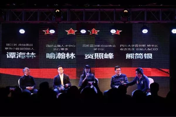 颁奖结束之后,便是《新经济与创新创业》的高端访谈环节,锦江区政协委员 谭海林;西部金融人才中心执行董事 喻瀚林;高新区创新创业协会秘书长 贺照峰;四川大学青创联秘书长,收衣先生创始人兼CEO熊简银为我们带来了一场精彩绝伦的头脑风暴。