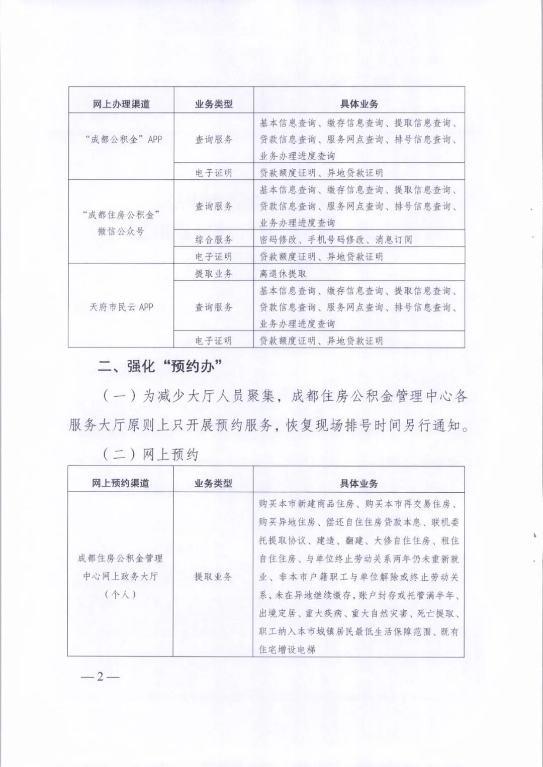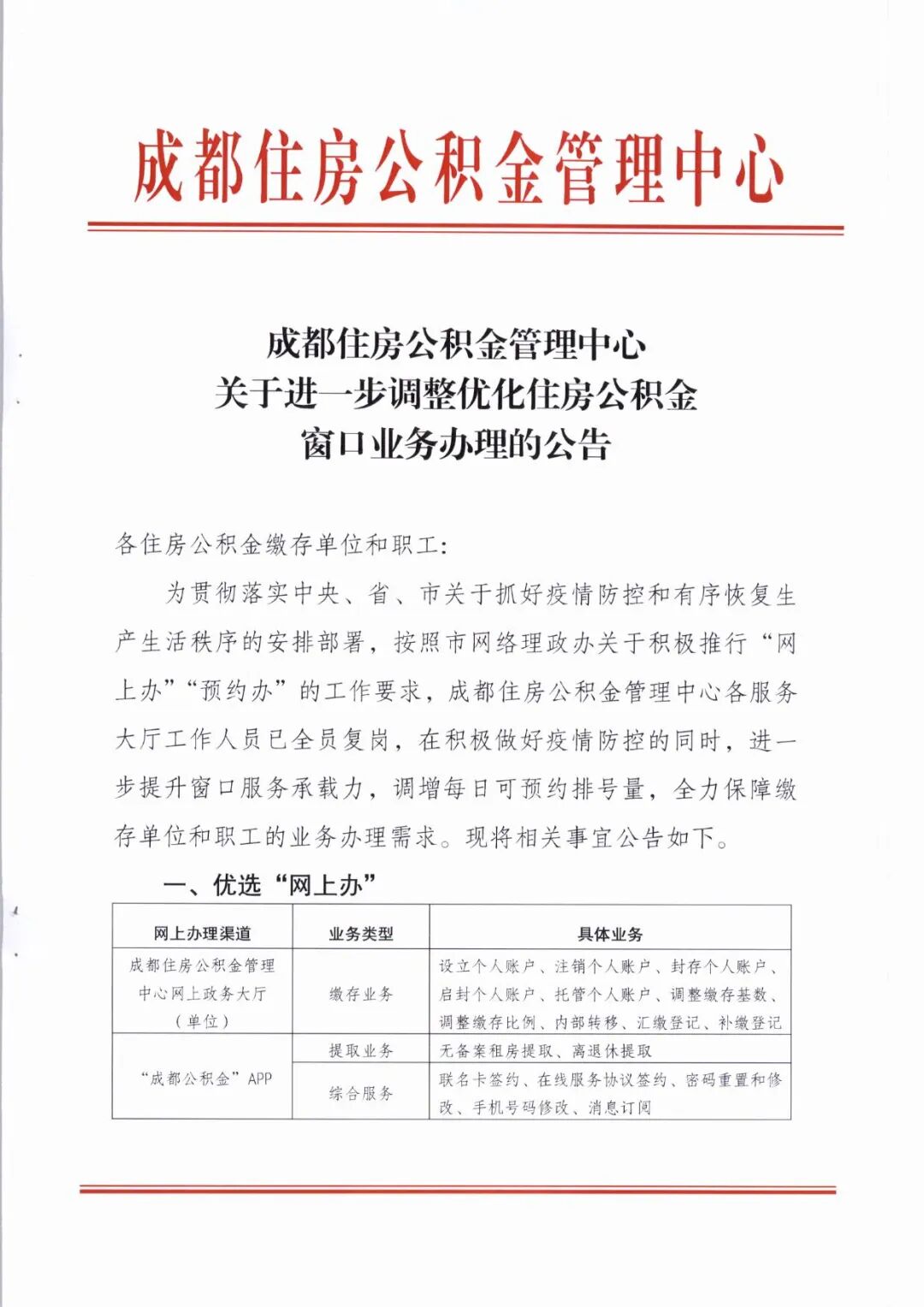 (一)为减少大厅人员聚集,成都住房公积金管理中心各服务大厅原则上只开展预约服务,恢复现场排号时间另行通知。