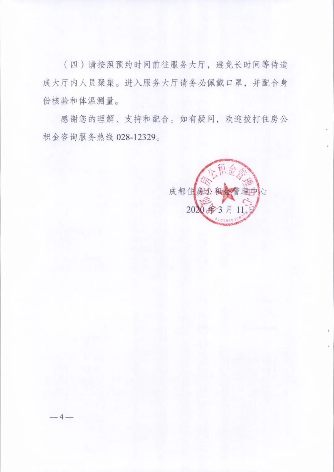 感谢您的理解、支持和配合。如有疑问,欢迎拨打住房公积金咨询服务热线028-12329。